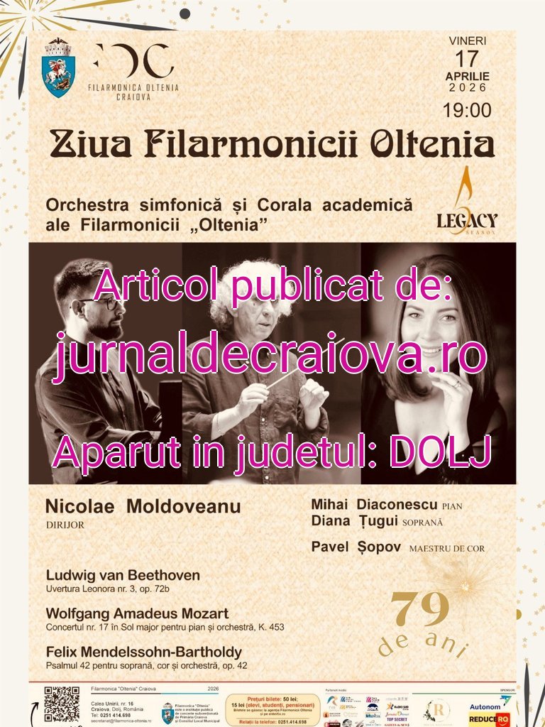 La 79 de ani de la înființare, Filarmonica „Oltenia” își onorează trecutul regal și își confirmă rolul de simbol cultural al regiunii, oferind publicului un concert ce constituie o filă de istorie vie. Evenimentul este inclus în „Abonamentul Melomanului” iar biletele pot fi achiziționate la prețul de 50 de lei și redus la 15 lei pentru elevi, studenți și seniori, de la agenția din Calea Unirii nr. 16 sau online: Bilete Concert simfonic . Detalii: