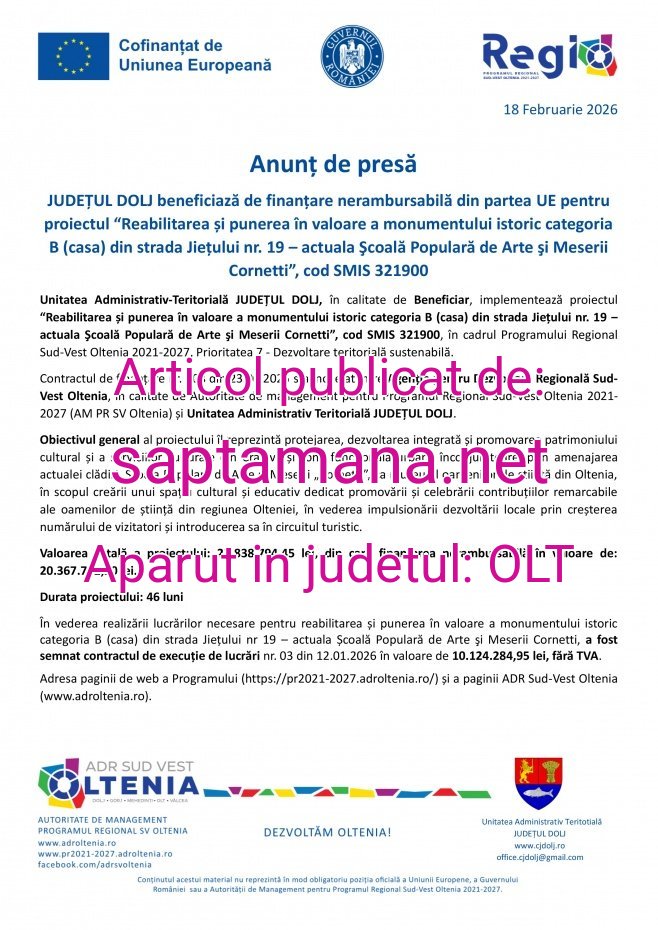 Judeţul Dolj beneficiază de finanţare nerambursabilă din partea UE pentru proiectul “Reabilitarea şi punerea în valoare a monumentului istoric categoria B (casa) din strada Jieţului nr. 19 – actuala Şcoală Populară de Arte şi Meserii Cornetti”