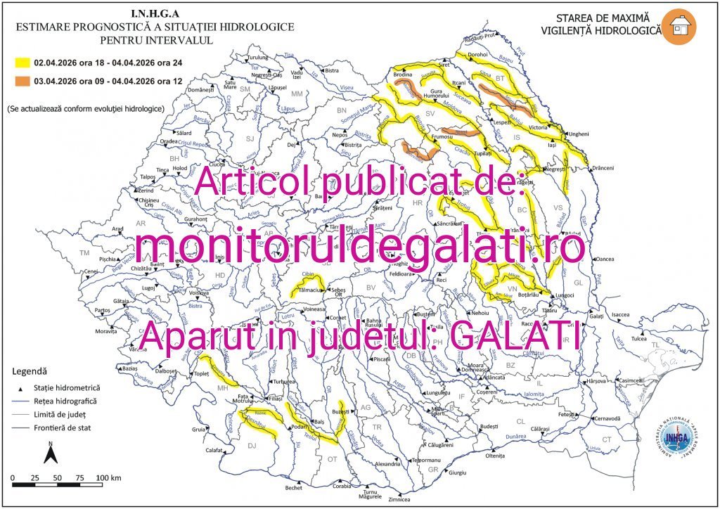 COD GALBEN: În intervalul 02.04.2026 ora 18:00 – 04.04.2026 ora 24:00 pe râurile din bazinele hidrografice: Desnăţui – bazin amonte Ac. Fântânele (judeţele: Mehedinţi şi Dolj), Motru – afluenţii aferenţi sectorului aval S.H. Broşteni (judeţele: Gorj şi Mehedinţi), Jiu – afluenţii de dreapta aferenţi sectorului aval confluenţă cu râul Motru – amonte S.H. Podari (judeţele: Mehedinţi şi Dolj), Olt – afluenţii aferenţi sectorului aval S.H. Sebeş Olt – amonte confluenţă cu râul Lotru (judeţele: Sibiu şi Vâlcea), Olt – afluenţii aferenţi sectorului aval confluenţă cu râul Olteţ (judeţele: Olt şi Dolj), Râmnicu Sărat – bazin superior şi afluenţi bazin mijlociu şi inferior (judeţele: Buzău şi Vrancea), Putna (judeţul Vrancea), Bârlad – bazin amonte S.H. Negreşti şi afluenţii aferenţi sectorului aval S.H. Negreşti (judeţele: Neamţ, Iaşi, Vaslui, Bacău, Galaţi şi Vrancea), Trotuş (judeţele: Harghita, Bacău, Neamţ, Covasna şi Vrancea), Moldova (judeţele: Suceava şi Neamţ), Bistriţa – bazin amonte Ac. Izvoru Muntelui şi afluenţii aferenţi sectorului aval Ac. Izvoru Muntelui (judeţele: Suceava, Neamţ, Harghita şi Bacău), Suceava (judeţul Suceava), Siret – afluenţii mici aferenţi sectorului aval confluenţă cu râul Suceava – amonte confluenţă cu râul Trotuş (judeţele: Suceava, Botosani, Iaşi, Neamţ, Bacău şi Vrancea), Jijia (judeţele: Botoşani şi Iaşi).
