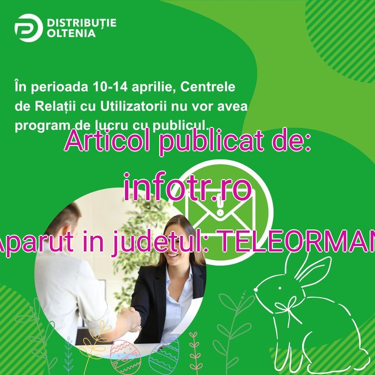 Cu ocazia Sărbătorilor Pascale, programul Centrelor de Relații cu Utilizatorii Distribuție Oltenia va fi adaptat acestei perioade. Astfel, în zilele de 10, 13 și 14 aprilie 2026, acestea vor fi închise pentru activitatea cu publicul. Activitatea va fi reluată începând cu15 aprilie 2026 , conform programului obișnuit, în toate centrele din Alexandria, Craiova, Curtea de Argeș, Băilești, Drobeta-Turnu Severin, Pitești, Râmnicu Vâlcea, Slatina, Târgu Jiu, Roșiorii de Vede, Caracal, Drăgășani și Câmpulung Muscel. Echipa Distribuție Oltenia va reveni cu forțe proaspete în ajutorul dumneavoastră. Pentru a evita timpul de așteptare, echipa Distribuție Oltenia recomandă utilizatorilor să își programeze vizitele în Centrele de Relații cu Utilizatorii, accesând secțiunea dedicată – https://programari.distributieoltenia.ro/page/programare-online.html . Procesul este unul foarte simplu și necesită doar câteva minute. În schimb, utilizatorii vor ști exact la ce oră trebuie să se prezinte în Centrele de Relații cu Utilizatorii, evitând astfel timpul de așteptare.