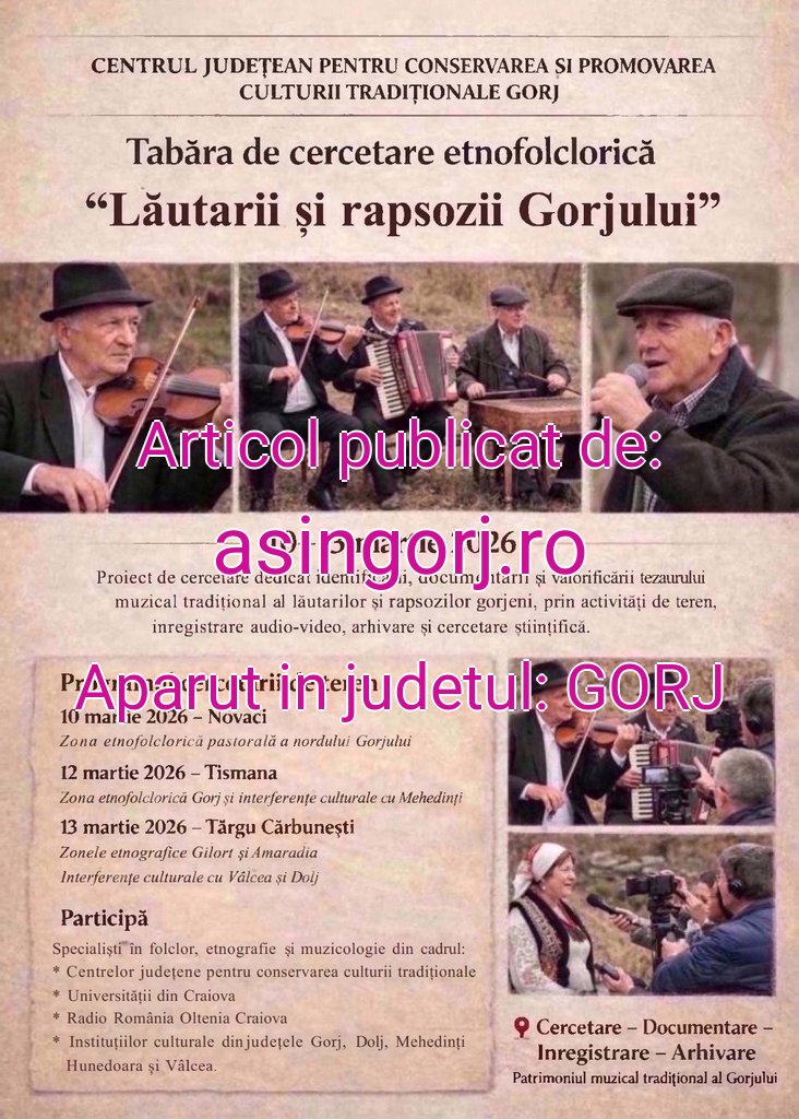 În perioada 10–13 martie 2026, CJCPCT Gorj organizează Tabăra de cercetare etnofolclorică „Lăutarii și rapsozii Gorjului”, un demers cultural și științific dedicat identificării, cercetării și valorificării tezaurului muzical tradițional al lăutarilor și rapsozilor populari din județ.