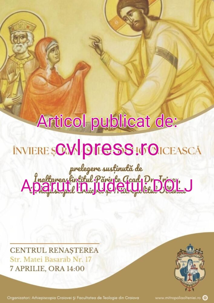 Evenimentul va avea loc începând cu ora 14:00, la Centrul „Renașterea”, situat pe Strada “Matei Basarab”, nr. 17, din Craiova. Prelegerea va fi susținută de Înaltpreasfințitul Părinte Dr. Irineu, Arhiepiscopul Craiovei şi Mitropolitul Olteniei, care va vorbi despre semnificația profundă a Învierii Domnului și despre importanța renașterii duhovnicești în viața fiecărui creștin. Conferinţa duhovnicească este organizată de Arhiepiscopia Craiovei și Facultatea de Teologie din Craiova. ,,Vă așteptăm cu dragoste și nădejde, pe toți fiii duhovnicești ai Arhiepiscopiei noastre, să ne adunăm în comuniune de rugăciune și ascultare, spre a primi cuvânt de învățătură ziditoare de suflet al Arhipăstorului nostru. Să ne deschidem, așadar, inimile și cugetele pentru a ascultacuvântul plin de har și lumină al Mitropolitului Olteniei, care ne va călăuzi pașii pe calea credinței, întărindu-ne în lucrarea virtuților și pregătindu-ne să întâmpinăm cu vrednicie șibucurie sfântă praznicul Învierii Domnului şi Mântuitorului nostru Iisus Hristos, biruința vieții asupra morții și a luminii asupra întunericului’’, au precizt organizatorii evenimentului.