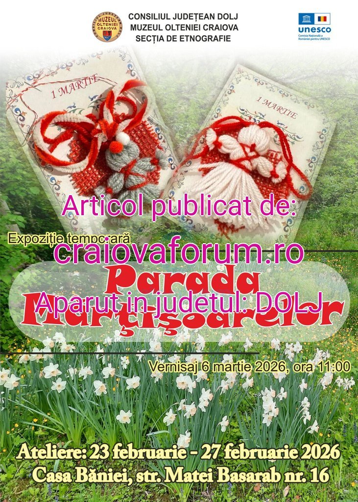 Craiova readuce mărțișorul în forma lui firească, de obiect meșteșugit și purtător de sens, printr-un proiect educativ dedicat copiilor. Muzeul Olteniei Craiova, Secția de Etnografie, în parteneriat cu CNR UNESCO și cu sprijinul Consiliului Județean Dolj, organizează, în perioada 23–27 februarie, la Casa Băniei, ateliere de creație pentru realizarea de mărțișoare tradiționale.