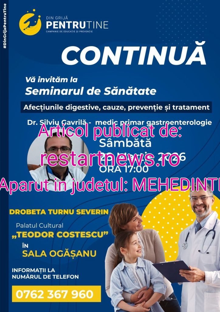 Sâmbătă, 28 martie 2026, de la ora 17:00, la Palatul Cultural „Teodor Costescu”, în Sala Ogășanu, va avea loc un seminar despre afecțiunile digestive, deschis tuturor celor interesați.