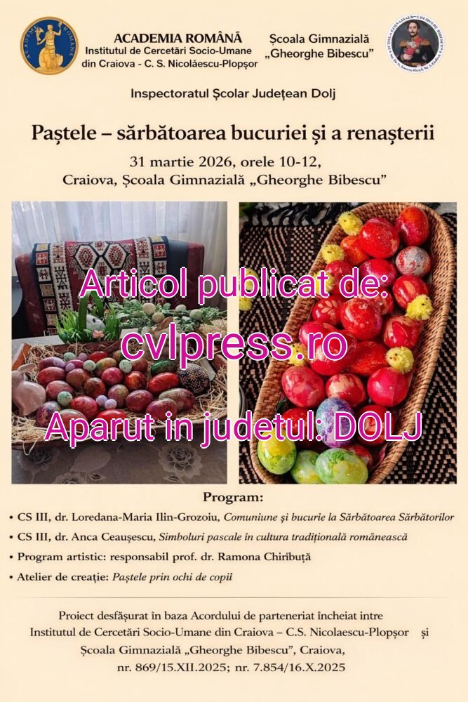 În data de 31 martie 2026, la Școala Gimnazială „Gheorghe Bibescu” din Craiova s-a defășurat proiectul cultural-educativ „Paștele – sărbătoarea bucuriei și a renașterii”, organizată de Institutul de Cercetări Socio-Umane din Craiova C.S. Nicol escu-Plopșor și Școala Gimnazială „Gheorghe Bibescu”, cu Inspectoratului Școlar Județean Dolj . În cadrul acestuia s-au reunit specialiști în etnologie, cadre didactice și elevi, într-o incursiune în universul tradițiilor românești. Un bun prilej de a aduce laolaltă activitatea de cercetare socio-umană și cea didactică.